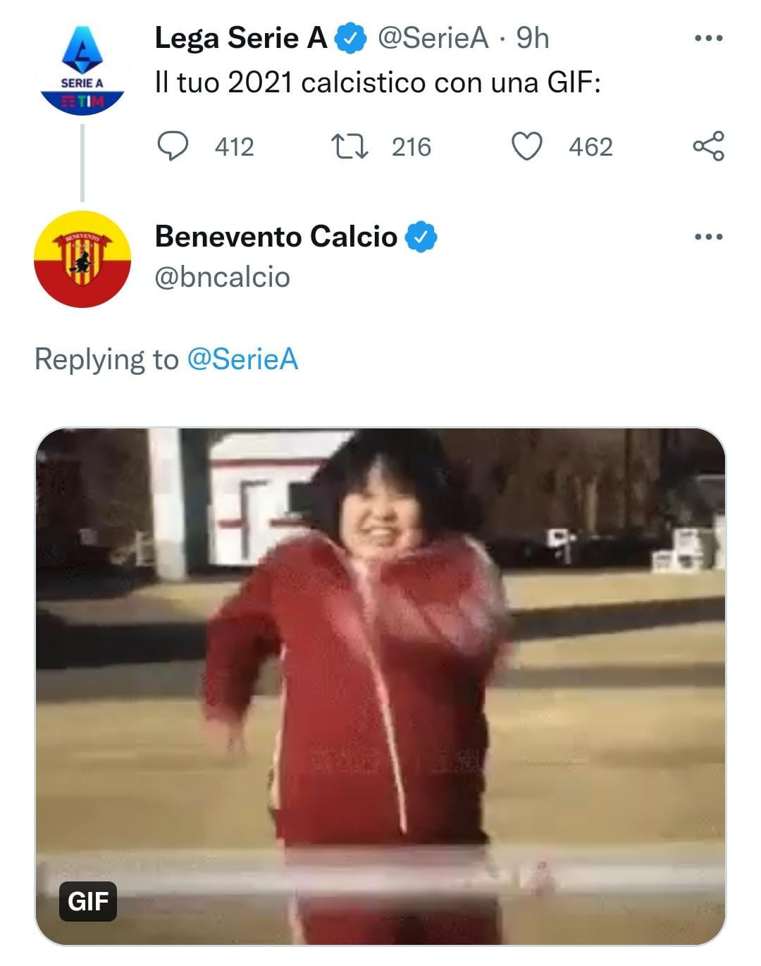 Il Benevento ha voluto riassumere l’andamento del suo anno con un simpatico post su Twitter, formulato in risposta all’invito dell’account della Lega Serie B a postare una gif che descrivesse il 2021 ormai al tramonto. La società campana ha pubblicato una famosa gif, il breve video di una donna che appena dopo aver superato un traguardo sprofonda in una buca. Evidentemente, una rappresentazione emblematica dello “sprofondo” dalla A alla B.