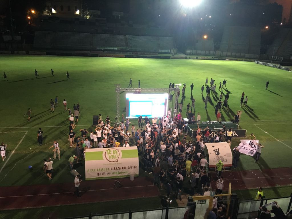 In nove contro undici. Come in un romanzo, al Massimino. Il vantaggio di Santini rimontato da Curiale e Lodi. Supplementari, rigori. Cinque a quattro. Il Siena vola a Pescara dove sfiderà il Cosenza nelle finalissima playoff. Ecco la festa dei tifosi che hanno assistito alla partita dal maxi schermo del Franchi.