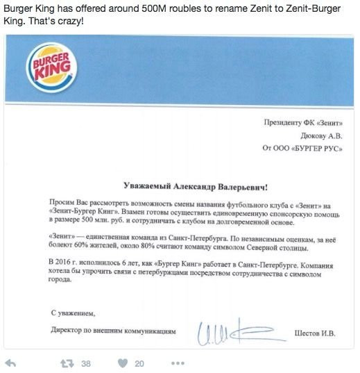 Un’aggiunta, non di una salsa o di patatine fritte con cui completare il menù, ma di un nome: Burger King fa sul serio, e la prova è il documento inviato alla società russa e riportato dal Financial Sports. Da Zenit San Pietroburgo a Zenit-Burger King. Dalla città di San Pietro, al club del Whopper. Fantasia o realtà? Vedremo cosa deciderà lo Zenit.