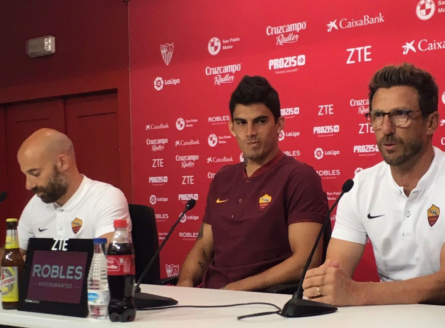 Meno 11 all’inizio del campionato e la Roma conclude il lungo tour di amichevoli, con un doppio incontro spagnolo contro Siviglia e Celta Vigo. Domani i giallorossi affronteranno al Sánchez-Pizjuán il Siviglia per il trofeo in onore di Antonio Puerta. Un ritorno a casa per Monchi, Perotti e Fazio. Proprio l’attaccante ha accompagnato l’allenatore Eusebio Di Francesco nella conferenza stampa prepartita. Meno di due settimane e sarà prima partita ufficiale contro l’Atalanta, l’allenatore giallorosso parla della condizione della squadra dopo la preparazione divisa tra Pinzolo e USA: “Dal punto di vista atletico e tattico stiamo crescendo. Una partita come quella di domani è necessaria per la condizione. Affronteremo il Siviglia come fosse una partita di campionato, per capire le condizioni della nostra squadra. Sicuramente sotto l’aspetto tattico dobbiamo lavorare tanto. La squadra è cresciuta, ma le situazioni vanno ripetute. Le partite servono a questo: a vedere le cose buone e meno buone. Comunque, abbiamo ancora tanta strada da fare. Sono contento della maggiore spigliatezza della fase offensiva, quando salirà la condizione dei giocatori potremo fare molto meglio”.