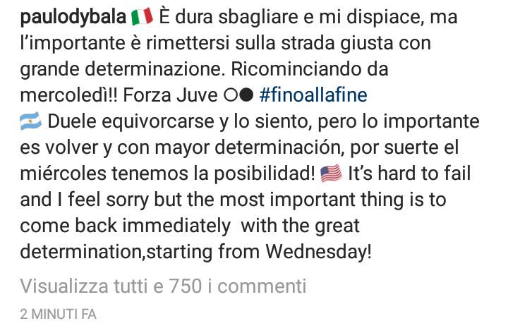 Social, il messaggio di Dybala ai tifosi della Juventus: “E’ dura sbagliare e mi dispiace”