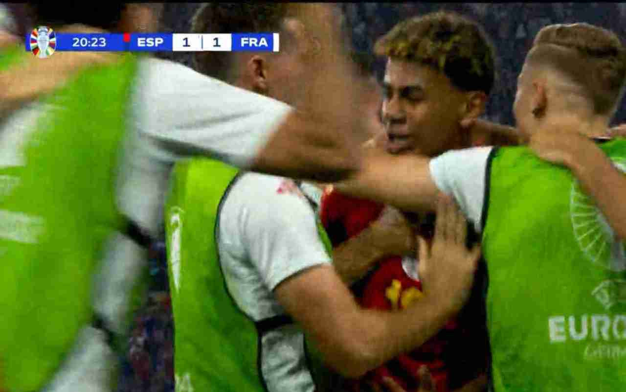 Nonostante il raddoppio francese, con Rabiot in pressing sul classe 2007, Yamal si sposta sulla destra per poi accentrarsi con il sinistro e far partire un tiro a giro imprendibile per Maignan.
