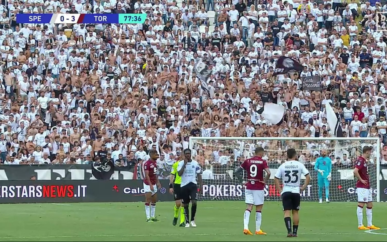 Dopo l’interruzione nel primo tempo a causa dei cori razzisti dei tifosi dello Spezia verso Juric, la partita del Picco è stata interrotta per una seconda volta.
