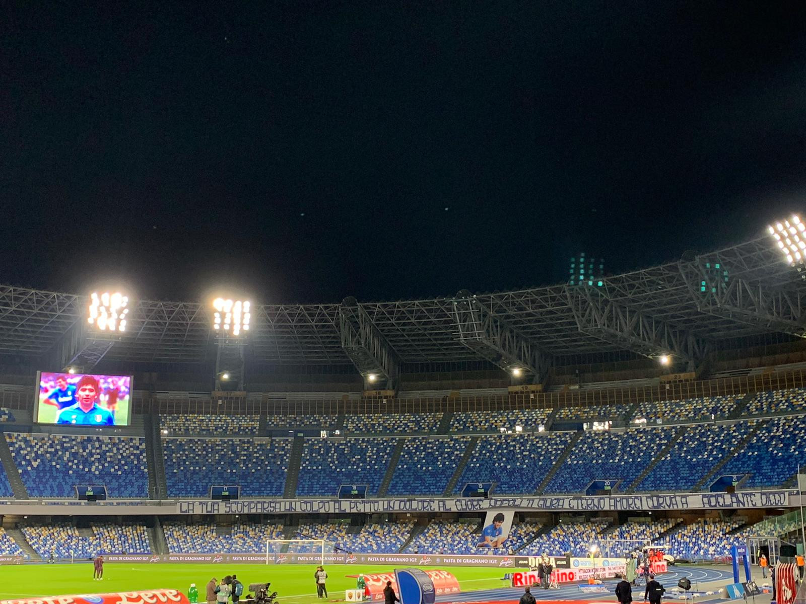 Seppure assenti a causa delle restrizioni legate all'emergenza-COVID-19, i tifosi azzurri della Curva A hanno infatti esposto lo striscione per Maradona all'interno dello stadio, dove Insigne e compagni scenderanno in campo alle 20.45.