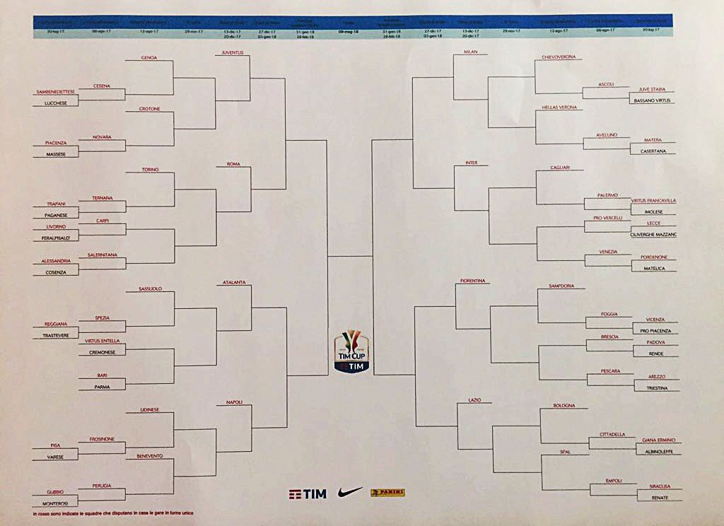 E mentre il calciomercato avanza, la voglia di campo torna a farsi sentire. La nuova stagione si avvicina e regala il il tabellone della prossima Coppa Italia. Oggi, infatti, nella sede della Lega Serie A a Milano, si sono svolti i sorteggi per la Tim Cup 2017/18. Il torneo inizierà il 30 luglio con il primo turno eliminatorio e si concluderà con la finale il 9 maggio 2018. Da una parte del tabellone figurano Juventus-Roma-Atalanta e Napoli, dall’altra Milan-Inter-Fiorentina e Lazio. Queste le otto teste di serie che partiranno direttamente dagli ottavi del 13 e 20 dicembre. Ecco il tabellone con i possibili incroci: