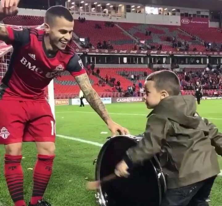 Quando si dice che i figli siano i primi tifosi dei loro papà… Chiedere a Sebastian Giovinco e al piccolo Jacopo. Ieri il Toronto ha vinto 1-0 in casa contro i Montreal Impact e a fine partita non solo l’attaccante italiano è andato sotto la curva per festeggiare. Insieme a lui c’era proprio Jacopo al quale è stato prestato un tamburo con cui a modo suo ha incitato ancora una volta i tifosi dopo quella serata già di festa per la vittoria. Un momento speciale di sicuro. “Gli è piaciuto”, ha commentato lo stesso Giovinco su Instagram. Ma alla fine il ‘Grazie’ per il prestito di quel tamburo è d’obbligo. ‘La Formica atomica’ in campo mai così… calciatore-papà insieme.