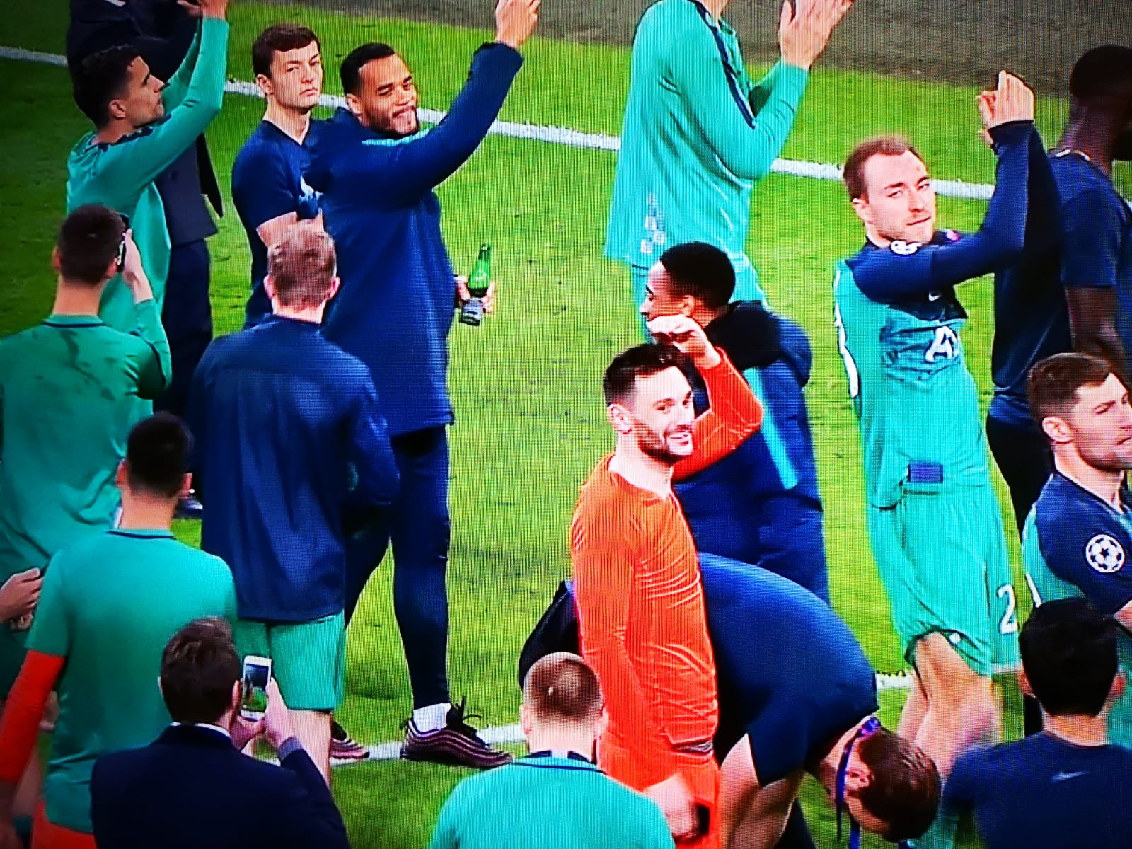 Minuti di festa in campo con Pochettino a guidare una 'Geyser dance' con i tifosi, i giocatori a celebrare la vittoria abbracciandosi. Un balletto di Son, Moura con il pallone ben stretto a sè. Premio di una tripletta storica e di una rimonta incredibile.