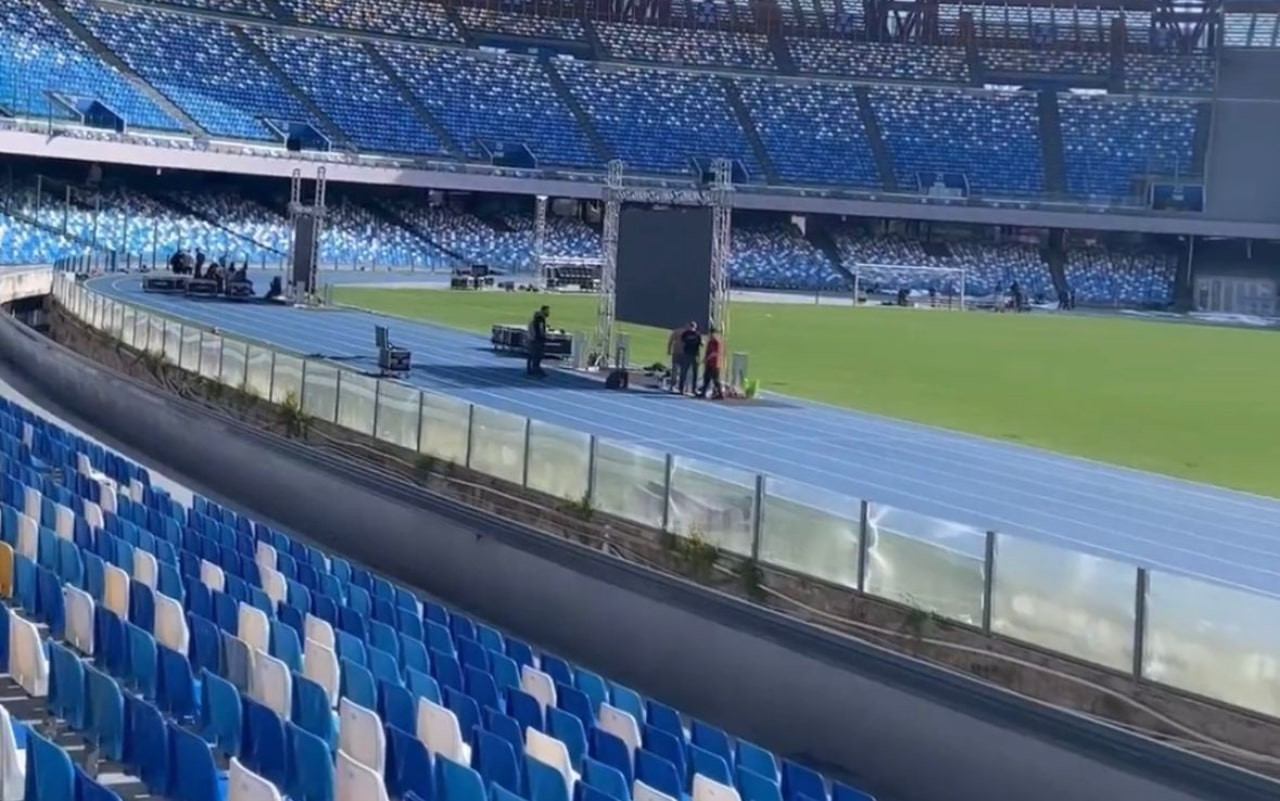 3 MAGGIO ORE 18:20 – Lavori in corso allo stadio Maradona: in corso l’allestimento dei dieci maxischermi dove i 60mila tifosi assisteranno alla partita tra Udinese e Napoli.