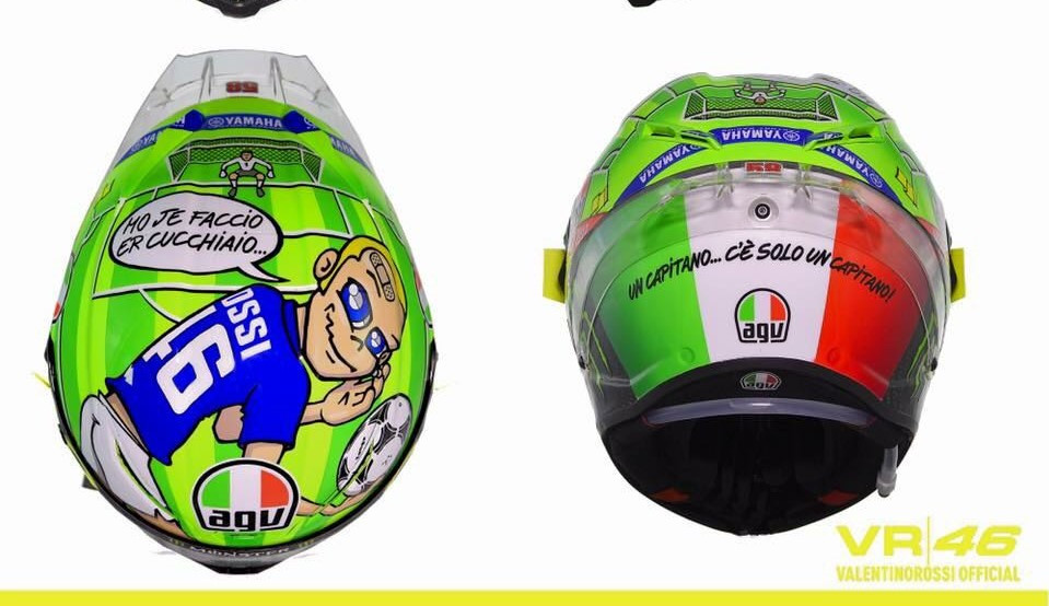 L’immancabile 46 giallo che sfuma nel 69 arancione, maglia della nazionale azzurra indosso e pallone in mano pronto ad essere spedito in rete: eccola la livrea speciale del casco che Valentino Rossi indosserà in occasione del Gran Premio del Mugello. Come ormai da tradizione, il campione di Tavullia ha svelato prima della gara l’inedita livrea per il GP di casa: il ‘Pupone’ Totti da una parte, l’amico Hayden dall’altra. Eccoli i pensieri scelti per una giornata speciale, come le dediche che Valentino e il suo staff hanno voluto fare al capitano giallorosso – fresco di ultima in campo con la Roma – e a Nicky Hayden, recentemente scomparso. “Mo Je faccio er cucchiaio” e “Un capitano… c’è solo un capitano!” le frasi scelte da Valentino per omaggiare Francesco Totti, tra il ricordo del tocco sotto a beffare Van der Sar agli Europei del 2000 e l’urlo dell’Olimpico giallorosso per l”Ottavo Re di Roma’. Impossibile non dedicare oggi un pensiero anche all’amico Nicky, con il suo numero 69 affiancato al celebre 46 sui due lati della mentoniera del caso. Pensieri speciali, formati Valentino: pronti ad accompagnarlo nella prossima tappa del campionato.