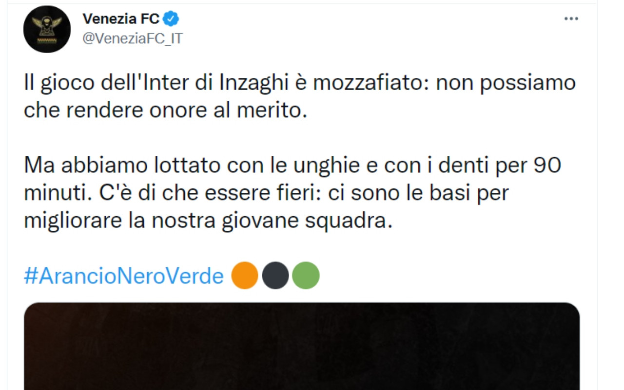 Infatti, il Venezia stesso ha scritto sul proprio profilo Twitter un messaggio di complimenti alla squadra nerazzurra: “Il gioco dell’Inter di Inzaghi è mozzafiato: non possiamo che rendere onore al merito“.