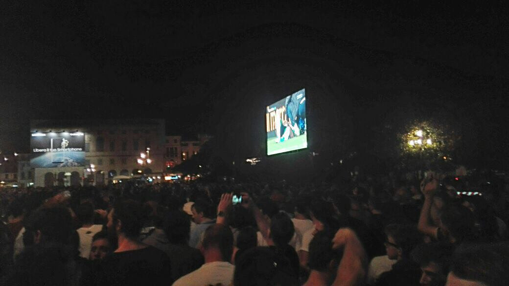 Una città intera in attesa della A, divisa tra Pizza Bra e lo stadio Manuzzi. L’attesa dei tifosi dell’Hellas Verona attorno all’Arena è da grandi occasioni. Basta un punto per festeggiare la promozione diretta. Oltre 10.000 persone riversate davanti al maxi schermo, tra cori, striscioni e due soli colori: il giallo e il blu.