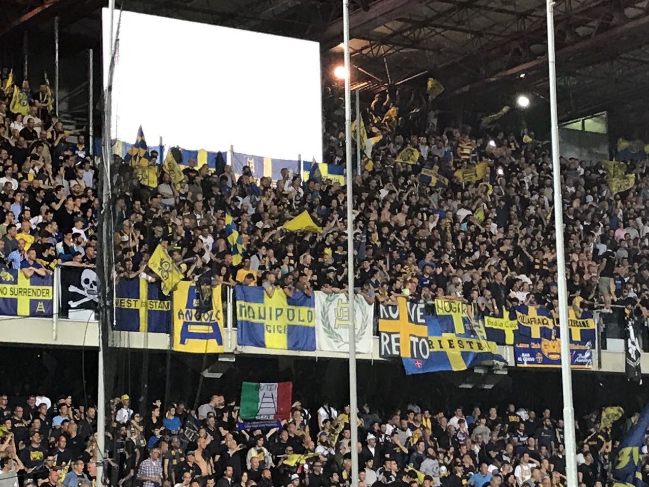Solo cose belle? No, a fare da contraltare ci pensano ansia e paura. Brividi scaturiti dai 2 gol del Frosinone contro la Pro Vercelli. Con il maxi schermo del Manuzzi a segnalare il pericolo in agguato. Risultato? Hellas in Serie A. Così è deciso. Merito degli scontri diretti a favore contro la squadra di Marino e di una mentalità perfetta. Sì, basta uno 0-0 colorato da belle trame e palle gol. Con la solita umiltà e un’immensa perseveranza. Perché oggi le parole è giusto che terminino con la lettera A. E ora il Verona leva la maglietta e indossa lo smoking. Bottiglia in mano, champagne stappato e maxi festa. Poi? Retromarcia dal Manuzzi, destinazione piazza Bra: ancora un ultimo viaggio con al collo quel pass meraviglioso. Si volA.