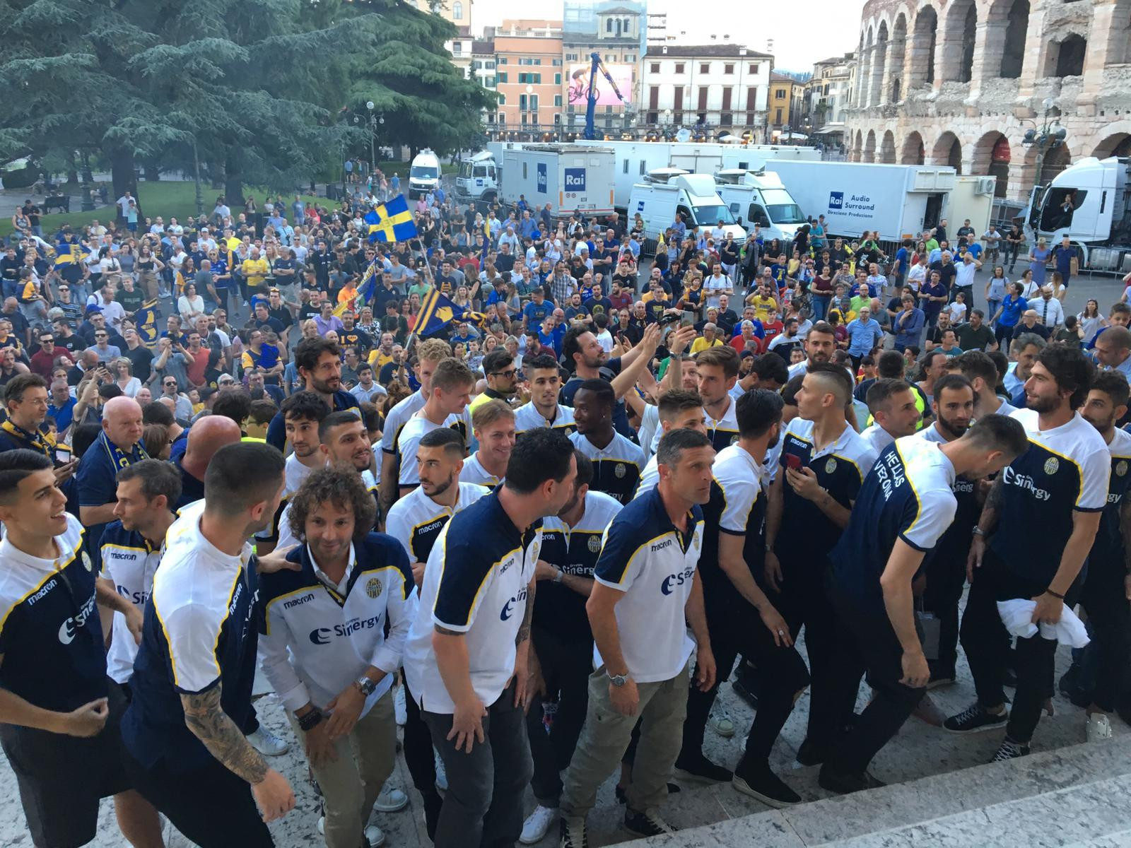 Dopo le celbrazioni dei giocatori in campo e la festa fino a notte fonda dei sostenitori gialloblù per le strade della città, i ragazzi di Aglietti e la loro gente si sono ritrovati in Piazza Bra. Foto, selfie, autografi e tanti sorrisi. Un sogno comune diventato realtà, la Serie A.