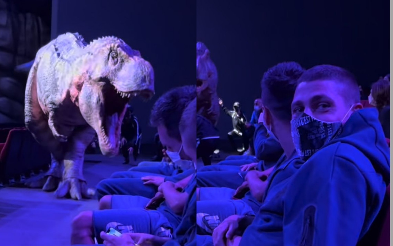I ragazzi di Galtier avevano assistito insieme a uno spettacolo in cui era presente una raffigurazione di un T-Rex con dimensioni reali. Una riproduzione che sembra davvero identica a quella vera, che ci siamo abituati a vedere nella saga ‘Jurassik Park, di Spielberg. Talmente simile al reale che Verratti e Marquinhos sembravano proprio tremare dalla paura, facendo morire (ma dal ridere) Presnel Kimpembé che, seduto accanto al brasiliano e all’italiano, ha ripreso la scena e ha regalato un sorriso a tutti i suoi followers, dopo aver pubblicato il video sul suo profilo Instagram.