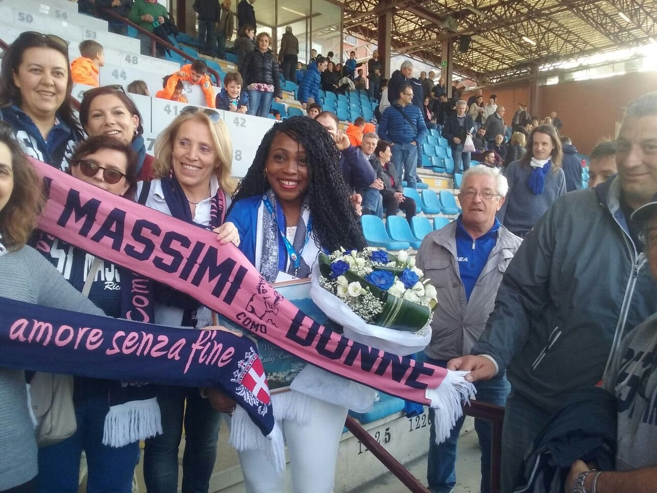 Sorrisi, disponibilità e un vestito, proprio per l’occasione, tutto bianco e azzurro nella prima di Lady Essien al Sinigaglia. Un mazzo di fiori e un tenero striscione di ringraziamento dei bambini del settore giovanile la fanno quasi commuovere perché per Akosua Puni è la prima volta da Presidentessa del Como allo stadio, e le prime volte non si scordano mai. Una stupenda coreografia accompagna i giocatori in campo per festeggiare un momento importante di una storia, quella del Como, che dura da più di un secolo. L’imprenditrice ghanese, appassionata di calcio sin da piccola, esulta con pacatezza alla rete su rigore di Pessina e batte un pugnetto di stizza sulla coscia quando l’espulsione di Chinellato sposta gli equilibri in campo e permette al Piacenza di pareggiare la gara con una punizione. Una ventata di freschezza e di curiosità la si gusta già dal pre-partita. Qualche tifoso commenta pragmaticamente: “Basta che compri qualche buon giocatore”. Altri pensano al futuro e all’onestà con cui si è presentata: “Ci è piaciuto il fatto che non ha promesso nulla di straordinario, la ringraziamo per aver creduto in questa città”. Una città che ha voglia di calcio, una tifoseria che è da Serie B. Proprio dove la Puni vuole portare questi colori. Di certo, però, non un esordio tranquillissimo: due espulsi ed arbitro contestato dal Sinigaglia. Finisce 1-2 per il Piacenza, la Signora Essien lascia lo stadio applaudendo sportivamente i suoi stremati calciatori. Nonostante il risultato è stato un pomeriggio di rinascita per il Como Calcio che ha trovato una proprietaria vogliosa di fare la storia del club.