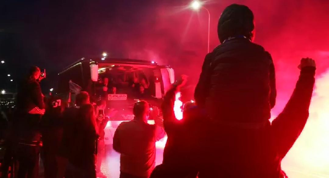 Cori, fumogeni, bandiere. Un'altra serata di festa per l'Atalanta ed i suoi tifosi che hanno accolto calorosamente l'arrivo della squadra a Zingonia, di ritorno dalla trasferta vincente di Roma contro la Lazio.