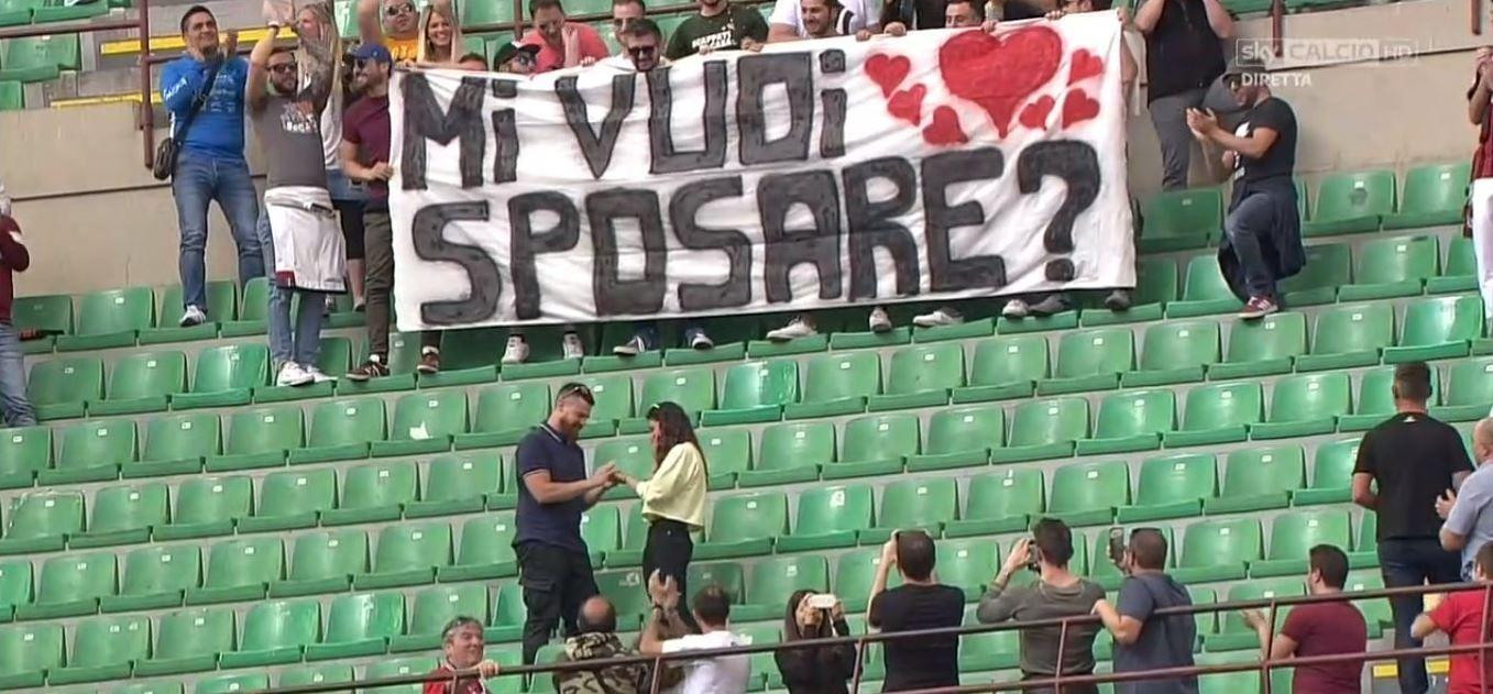L’amore per la squadra del cuore e quello per la propria compagna. Risultato? Un pomeriggio indimenticabile con proposta di matrimonio sugli spalti. Nella cornice di San Siro un tifoso rossonero ha sorpreso così la sua fidanzata: “Mi vuoi sposare?”. La fatidica domanda su uno striscione e l’anello per strappare una promessa d’amore alla Scala del Calcio. Il tutto accompagnato dalle note di ‘Million Reasons’ di Lady Gaga e dalla voce dello speaker che ha raccontato in diretta al resto dello stadio cosa stava accadendo. Un fuori-programma sentimentale a San Siro, prima del fischio d’inizio di Milan-Fiorentina, con il lieto fine: il ‘sì’ di lei.