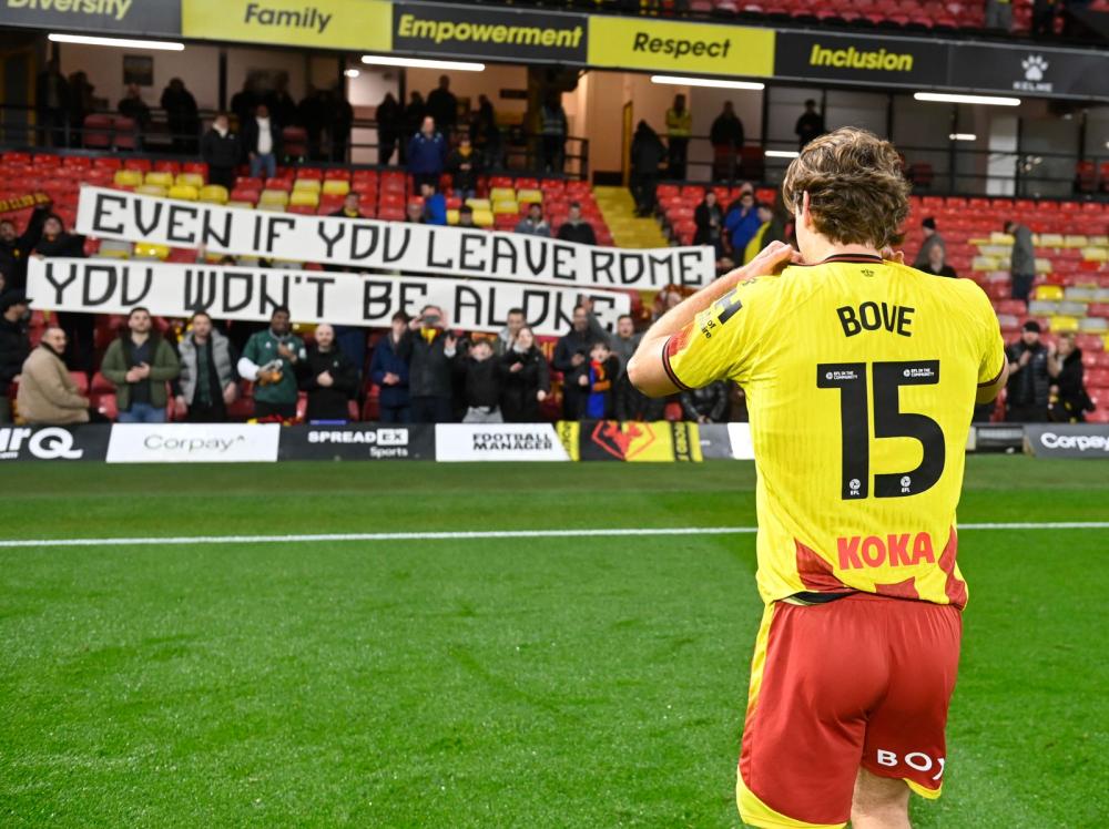 LA FESTA CON I TIFOSI - Dopo la rete, l'ex Roma è corso a festeggiare con i tifosi sugli spalti, portato sulle spalle da un compagno e abbracciando chi era presente in tribuna, ma non solo. A fine partita, infatti, Bove è andato a ringraziare un gruppo di tifosi della Roma, presenti a Vicarage Road con uno striscione che recita messaggio davvero significativo: "Anche se lasci Roma non sarai solo".